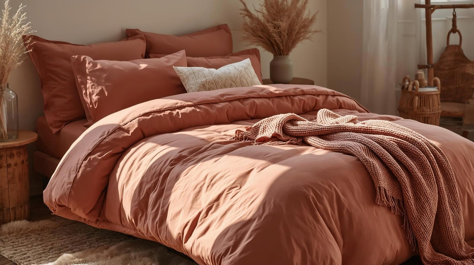 Pair the Desert Clay quilt cover with neutral-toned sheets and natural wood furniture to create a serene and inviting bedroom atmosphere.